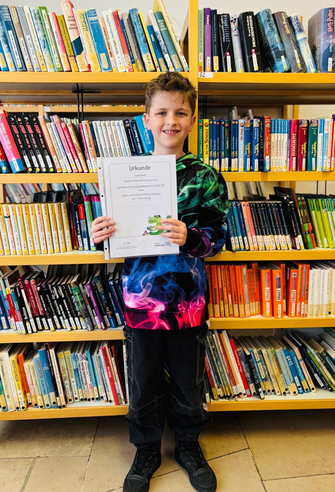 Großer Erfolg für einen jungen Leser: Liam Koch, Schüler der Grundschule der Gemeinde Nohfelden, hat am 11.06.2025 den Landesentscheid des Lesedino-Vorlesewettbewerbs 2024/2025 gewonnen.
