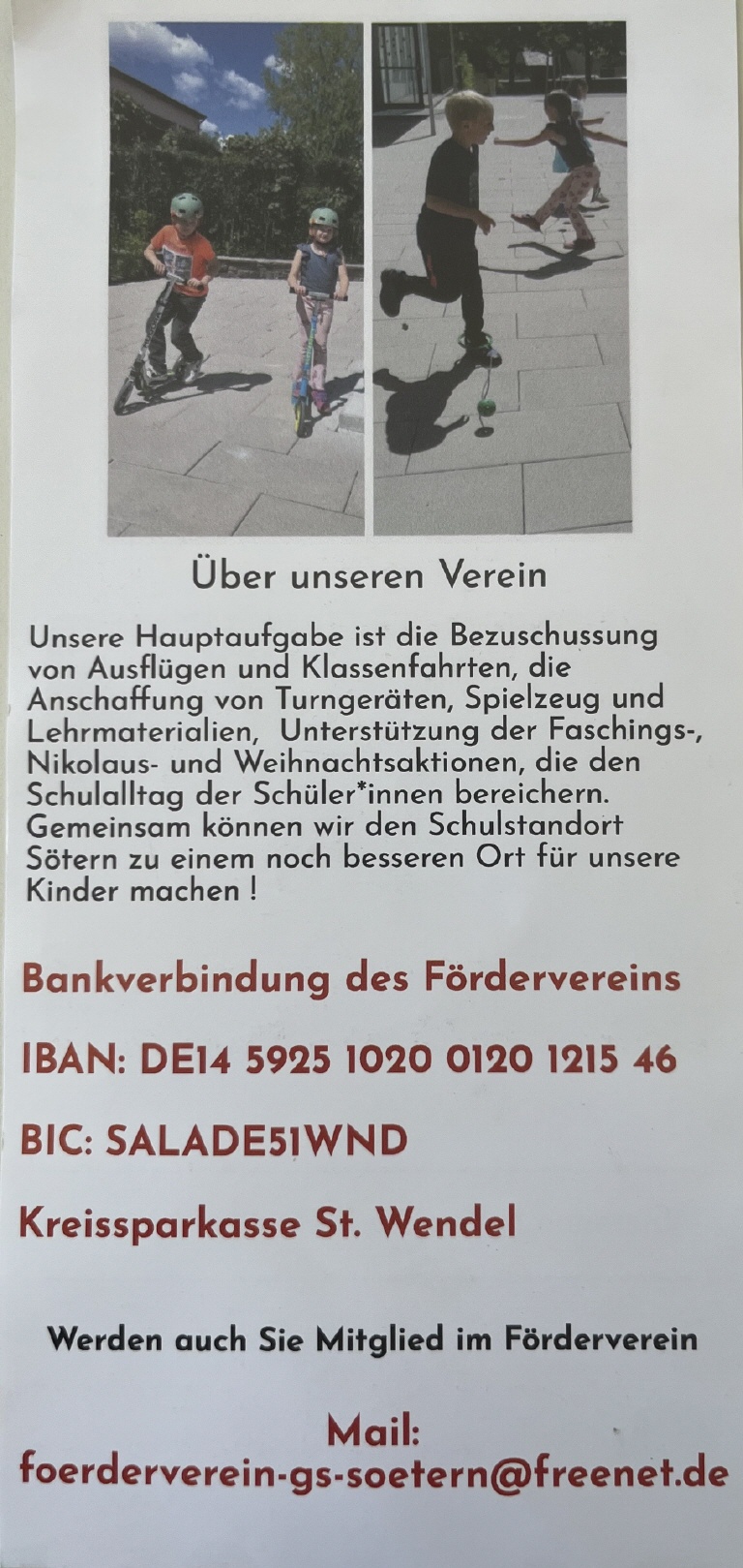 Der Förderverein für den Grundschulstandort Sötern wurde am 7.07.2004 gegründet. Folgende Aufgaben hat der Förderverein sich gegeben: