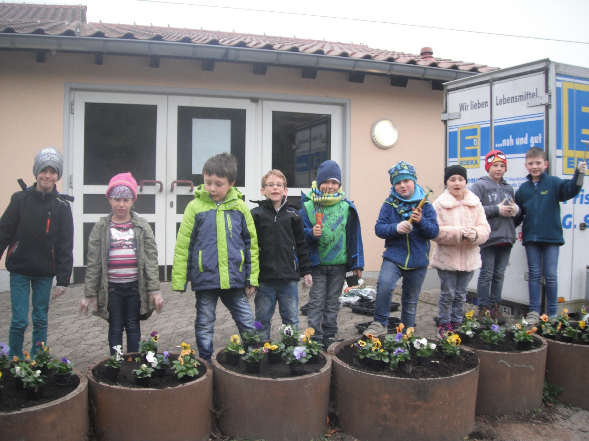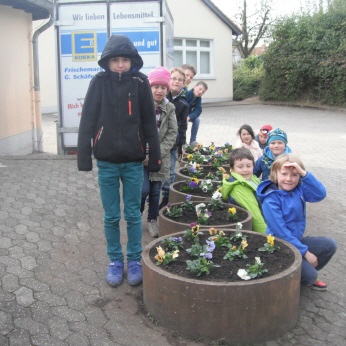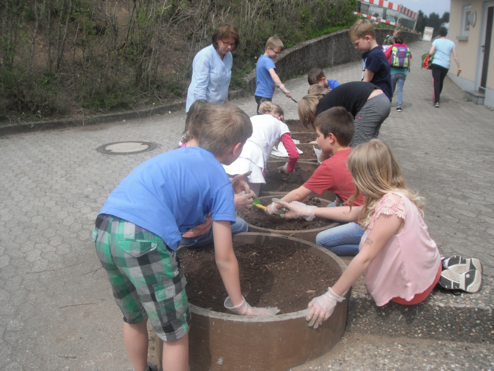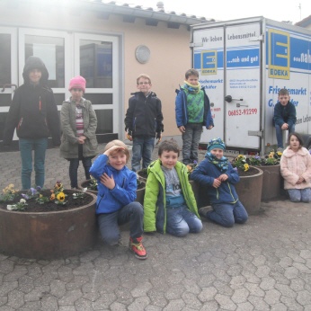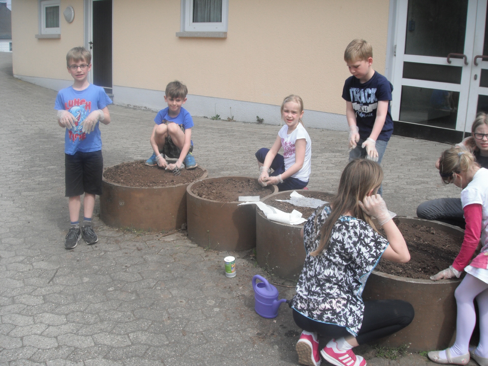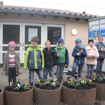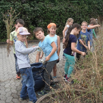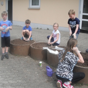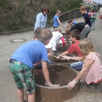 Sich mit der Natur zu beschäftigen ist ein pädagogisches Anliegen unserer Schule. Die Mitarbeiter/-innen der Freiwillige Ganztagsschule haben dieses Erziehungsziel mit den Kindern am Nachmittag durch praktisches Handeln umgesetzt. Unter der Leitung von Monique Becker wurden im Sommer gemeinsam die Pflanzkübel im Eingangsbereich der Freiwilligen Ganztagsschule mit Wildblumen besät. Im Herbst entfernten die Kinder die verblühten Sommerblumen und ersetzten diese durch neue winterfeste Blumen. Das blühende Ergebnis kann sich durchaus sehen lassen. Denn es verschönert den Eingangsbereich der FWGTS und der Turnhalle.